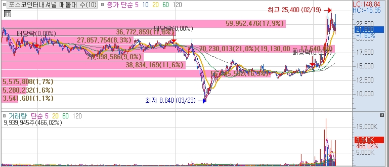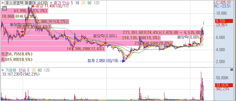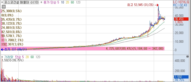 한국전기연구원과 리튬황 배터리용 양극재 개발 기술이전 계약을 체결한바 있다는점과, 포스코가 인수한 리튬염호(소금 호수) 가치가 35조원이라는 소식에 시세를 보여주며 관련주로 편입