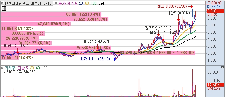엔터테인먼트 사업을 전개하는 다날엔터를 주요자회사로 거느리고 있다는점에 관련주로 부각